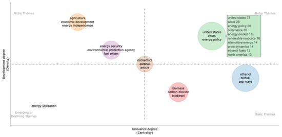 The upper right quadrant of Figure 10 represents themes with a higher degree of development (density) and relevance (centrality), seen as key themes in the literature, among which “Energy Policy” and “costs” stand out. As expected, another key theme found in this analysis was “United States”, defined as one of the keywords in the search strings. Apart from those, other driving themes are “price dynamics”, “commerce”, and “energy market”. Declining or emerging themes are located in the lower left quadrant. In this research, the results suggest that the topic “energy utilization” is an emerging topic. The lower-right quadrant shows sample basic themes. These themes refer to general themes in the different areas of investigation. They include “ethanol”, “biofuel”, “zea mays”, “biomass”, “carbon dioxide”, and “biodiesel” from our sample. Finally, the upper-left quadrant shows themes of high density but of lesser importance to the sample or limited importance to the field (low centrality). Within these themes, “agriculture”, “economic development”, “energy independence”, “energy security”, “Environmental Protection Agency”, and “fuel prices” are the ones that stand out.