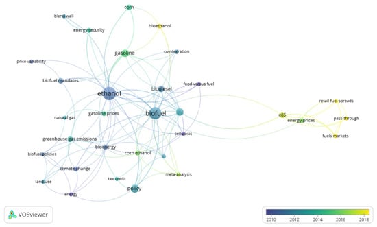 In sequence, we created Figure 11 using the VOSviewer software, and it is based on the co-occurrence information of the authors’ keywords [40]. In this figure, the node sizes represent the number of times these keywords were used by the articles in the sample; the connecting lines indicate that these keywords were used in the same publication, and the colors are related to the year of publication. The relevance of the topics “Renewable Fuel Standard” and “policy” protrudes, even though they were not included in the search strings. This network also allows the identification of trending topics for the area, as they represent interests in recent research, such as “retail fuel spreads”, “pass-through”, “fuel markets”, “E85”, or even “energy prices” and “meta-analysis”.