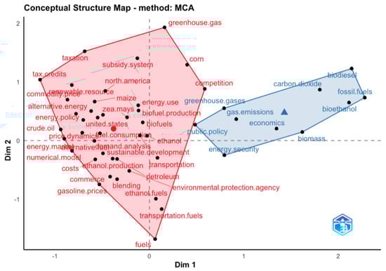 The results of this figure are to be interpreted based on the distribution of points and their positions along the dimensions. The closer the keywords are in the figure, the greater their similarities in distribution. The figure allows the identification of new latent variables from the formation of clusters in a set of categorical variables. In this way, we identify two distinct clusters. The first cluster (in red), seems to be more relevant due to its size and centrality in relation to dimensions. The red cluster contains important keywords, such as “price dynamics”, “commodity price”, “gasoline prices”, “blending”, “taxation”, and “subsidy system”, which are terms associated with the price and market dynamics of biofuels in the U.S. In the second cluster (in blue), keywords such as “economics”, “energy security”, “public policy”, and “gas emissions” are highlighted as terms associated with the development of public policies for the implementation of biofuels and their environmental impact. This split corresponds to the exploratory and introductory review we provide in the Introduction.