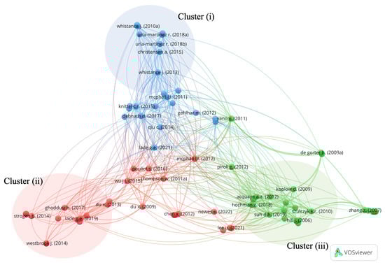 Through the use of clustering techniques, it is possible to present a map that highlights areas corresponding to the clusters of nodes identified. Using VOSviewer software, we calculated a bibliographic coupling network (for more, see [41]), whose graphical results are shown in Figure 13. In this analysis, the relationship between studies was determined based on the degree to which these articles are cited in the same publication.