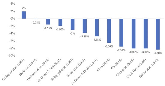 Condon et al. [13] provides a meta-analysis of estimates of corn-ethanol on corn prices and shows that increasing the production of corn-ethanol by one billion gallons increases corn prices by three to four percent. Persson [14] then presents a systematic review of the literature similar to ours but explores the effect of biofuels’ energy demand on agricultural commodities, whereas we focus on the so far much-less-investigated effect of ethanol on gasoline prices.