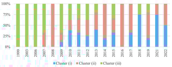 Finally, Figure 16 shows the evolution of the representativeness of each cluster over time. We note that at the beginning of the research on the subject, the most influential cluster was the one that addressed the impact of biofuels on environmental aspects (cluster (iii)). However, this scenario has changed, and the figure makes it possible to identify that studies that assess the impacts of biofuels on commodity prices and overall price dynamics (cluster (i)) have been of greatest recent interest, followed by the assessment of the impacts of public policies on the implementation of ethanol and flexibility in the formulation of fuel blending (cluster (ii)). In this way, the topics associated with clusters (i) and (ii) will represent the greatest opportunities for future research.