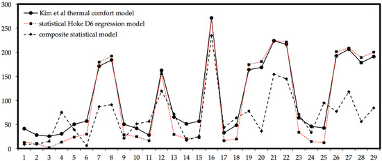 where Icl (in clo) is dynamic clothing insulation, and Tout6a.m. is the measured outside temperature at 6 a.m. The R-squared value of this predictive model was 0.33. According to their observed values, Kim et al. [28] found that the ASHRAE model underestimated the clo value when Tout6a.m. < 18 °C and overestimated the clo value when Tout6a.m. > 18 °C. Nevertheless, Kim et al. [28] detected up to a few degrees (°C) of inconsistency between ToutMIN and Tout6a.m. and proposed an improved version of the ASHRAE Standard 55 model. Their predictive model was built in relation to the outside daily minimum air temperature, ToutMIN, instead of Tout6a.m.. This model had a very high R-squared value of 0.37 [28] and was formulated mathematically as follows: