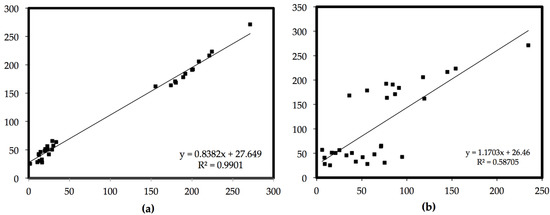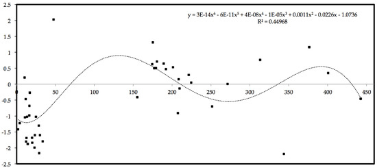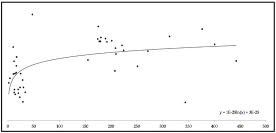 In Figure 7, we can observe that the entropy of our system had a tendency to increase according to a logarithmic relation. Consequently, our predictive system could not robustly forecast in terms of absolute location very small values of thermal absorptivity (b) situated in the lower region of the data distribution (<50), since the entropy was not yet stabilized; thus, our system was in a state of total disorder. However, the entropy of our system tended to be constant for values of b that were higher than 50. This meant that the robustness and predictive capacity of our model were quite high for these values. This was also seen in Figure 1, Figure 2, Figure 3 and Figure 4. In particular, in Figure 3, we saw that the Hoke D6 regression model, even though it correctly represented the patterns, continuously underfit the absolute locations for values < 50. Figure 7 explains why this happened—within this range of values, the entropy of our system increased logarithmically, and so the disorder of our system dominated. Outside this range of values, the entropy of our system tended to be stable, and so, for this reason, the predictive capacity of our model provided greater accuracy for thermal absorptivity (b).