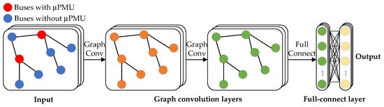 In this part, we proposed an SR model based on GCN to solve the above problem. As shown in Figure 1, the fault data simulated by OpenDSS software is utilized for model training. The model consists of two graph convolution layers and one full connection layer. The inputs of the model are the whole distribution network buses’ feature data, generated based on the key buses‘ measurements. In addition, the outputs are estimates of the true bus measurement values for the entire distribution network. For each type of feature described in the previous paragraph, a separate SR model was used for feature reconstruction.