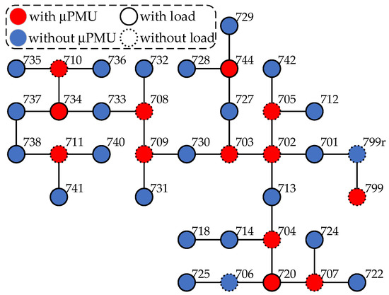 The IEEE 37 bus system, as shown in Figure 6, is utilized here for both simulation and experimental tests to validate the proposed method. Based on the definition of the key bus in Section 2.1, measurements are obtained from μPMUs installed at buses 702, 703, 704, 705, 707, 708, 709, 710, 711, 720, 734, 744, 799.