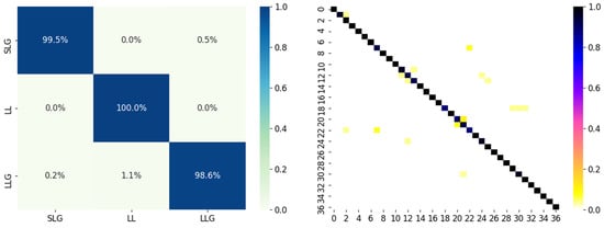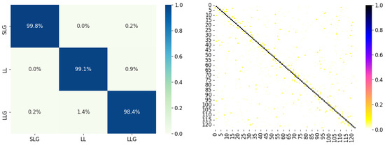 The performance of the proposed method in the IEEE 123 bus system is shown as the confusion matrix in Figure 14. It can be proved that the proposed method can still achieve good performance in complex distribution networks such as the IEEE 123 bus system, since the average accuracy of the fault classification and location model are still above 98% and 95%, and the erroneous location is mostly distributed near the fault bus.