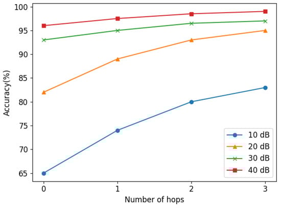 The proposed method is tested under various fault resistances in this part. Specifically, we chose fault resistances of 0.05 Ω, 10 Ω, 25 Ω, and 1000 Ω for the experiments. The fault location results are shown in Figure 9. Here we define a k-hop accuracy to represent the accuracy of the error locating bus within k hops Ω from the real fault bus, since the zero-hop accuracy is not satisfactory when the fault resistance is very small or large.