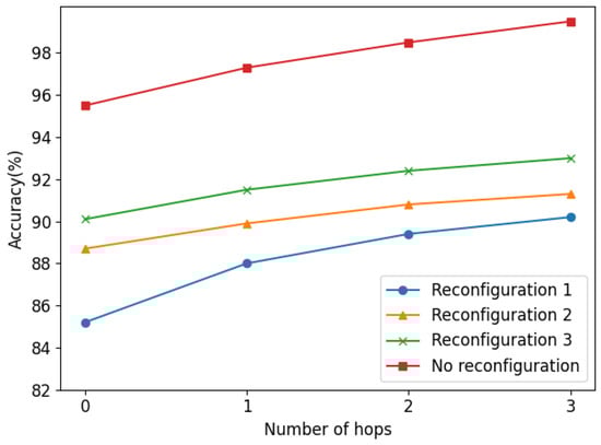 The location results are shown in Figure 12, and more numeric comparison results are in Table 5. It is shown that the performance of the proposed method degrades somewhat due to the reconfiguration of the distribution network, which is deemed to be affected by the robustness of the proposed model and the position changes of the key buses after network reconfiguration. In addition, the closer the reconstructed network is to the original network, the better the performance of the proposed method is. However, the zero-hop locating accuracy and three-hop can still be above 85% and 90%. respectively. Note that the reconfiguration scenarios are not involved in the model training process, which means the proposed method is somewhat robust to distribution network reconfiguration.