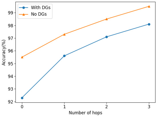 To simulate a multi-DGs condition, DGs are added at buses 718, 725, 735, and 741 in the IEEE 37 Bus system. Based on the definition of the key bus in Section 2.1, and based on the original allocation of μPMU in Section 3.1, μPMU should also be installed on the above bus connected to DG to better obtain the characteristic information from DGs. The numeric results are shown in Table 6, and Figure 13 shows the k-hop fault location results. It is shown that the performance of the proposed method degrades slightly with DG access. However, the zero-hop locating accuracy is still 92.3% and the three-hop accuracy can also be above 98%, which proves that the proposed method is somewhat robust to DG access.