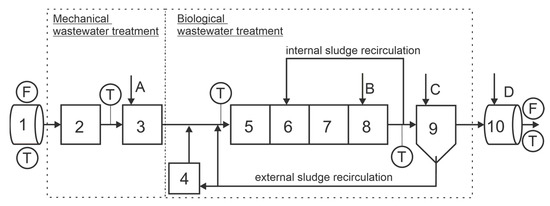 Operational diagram of the Mokrawica WWTP: 1. Wastewater inflow, 2. Screen, 3. Sand box, 4. Predenitrification/retention chamber, 5. Anaerobic chamber, 6. Anoxic chamber, 7. Transitional nitrification, 8. Aeration chamber, 9. Secondary sedimentation tank, 10. Treated sewage disposal; A, B, C, D—Proposed heat recovery location, F—flowmeter, T—temperature measurement.