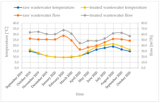 Figure 2 summarizes the average monthly wastewater flow rates and temperature recorded over a one-year period (September 2019–October 2020). The lowest average temperatures and wastewater flow rates were recorded in February (9.5 °C) and April (33.1 m3/h), respectively. The annual variability profiles of the parameters at the input and output of the WWTP are similar. The effluent temperature at the outlet of the WWTP is slightly higher during the warmer seasons, which may be due to more sunshine during this period. The difference in the values of raw and treated wastewater streams is almost constant over the studied period and may be due to the failure to account for the amount of wastewater being hauled to the disposal station and/or the measurement uncertainty of the large volume streams.