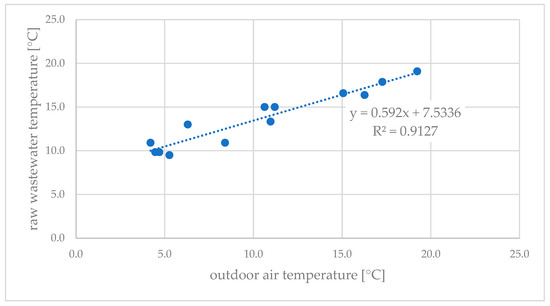 The relationship between the monthly average outdoor air temperature and the temperature of raw wastewater flowing into the treatment plant is shown in Figure 3. There is a strong correlation between outdoor temperature and wastewater temperature. The lowest average raw wastewater temperature occurs in February (9.5 °C). This indicates the possibility of heat recovery from influent wastewater even in the coldest seasons of the year. It is important to remember not to excessively inhibit or stop the processes of biological treatment of wastewater below a certain temperature (below 5 °C).