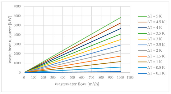 Based on Equation (1), a general function of the available waste heat resource was determined as a function of the wastewater flow rate and temperature reduction rate. The results are illustrated in Figure 4 and are in line with the available literature [45].