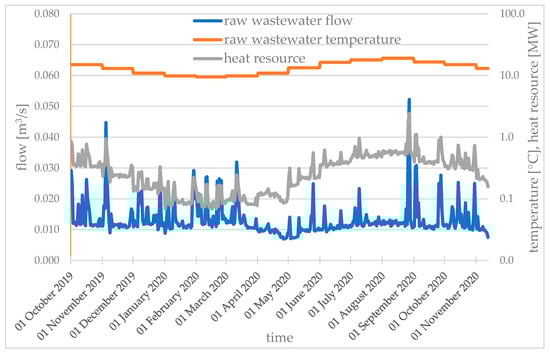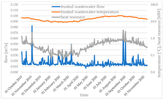 Figure 5 and Figure 6 show measurement data for the flow and temperature of raw and treated wastewater, respectively, at the inlet and outlet of the treatment plant. Based on that information, the available heat resource was determined from Equation (1). The minimum value of the temperature to which the wastewater can be cooled as a result of heat recovery was assumed as 8 °C.