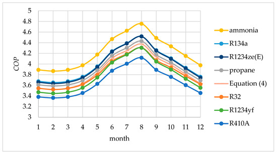 Additionally, the COP calculated from Equation (4) was also shown in Figure 7. The obtained results are within the average value of COP for different refrigerants. Hence, Equation (4) can be used as a general prediction of the COP variability for further analysis.