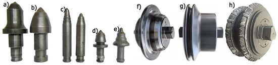 Cutting tools: (a). conical picks of longwall shearers, (b). conical picks of road headers, (c). conical picks of salt mining machines, (d). conical picks of concrete milling machines, (e). conical picks of milling machines for asphalt road surfaces, (f). symmetrical discs, (g). asymmetric double discs, and h. reinforced discs (a–e) [9], (g–h) [25]).