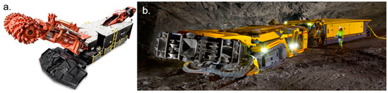 Examples of mining machines with conical picks and discs [17]: (a). ICUTROC road header produced by Sandvik and (b). Epiroc Mobile Miner 22H.