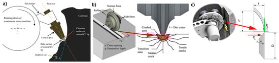 Mining methods based on the use of conical picks and discs: (a). cutting [29], (b). static pressure [4], and (c). undercutting [28] (D—disc diameter, α—disc angle, t1—cutting depth, t—cutting spacing, Pb—side force, Pd—normal force).