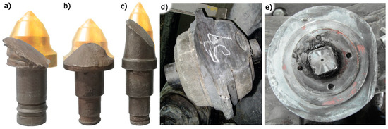 Examples of excessively worn tools: (a–c). conical picks (the shape of the new pick has been marked in colour) [30], (d). symmetrical disk [32], and (e). asymmetric disk [31].
