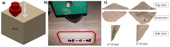 An example of such simple tests is pressing a conical pick into the rock at different distances from the edge of the sample. One of the tests involved pushing the pick vertically down and measuring the resulting chips (Figure 5). During the tests, the force was recorded, which allowed for evaluation of the energy consumption of the process [35].