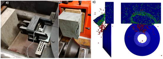 Laboratory and DEM tests of the process of chipping the face with a disc tool [38,39,40]: (a). test bench with rock and disc, (b). chip after test, (c). DEM results (top and side view).