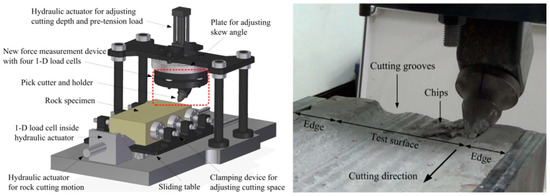 An example of an LCM test bench that has been developed in recent years is shown in Figure 9. Being much smaller than the previous ones, it allows cutting with a length of approx. 300 mm. The maximum normal force is only 15 kN, and the drag force reaches 10 kN. The depth of the cut and feed are controlled using hydraulic cylinders. The mounting plate allows changing of the pick’s skew angle. The pitch of the cut is set by manually moving the sample. Three forces are measured in the measuring head and on the sample feed actuator [41].
