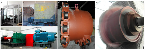 Full-size bench for testing the cutting process: (a). measuring cabin, (b). the test plate with a sample, (c). 250 kW drive system, (d). disc cutter head, and (e). cutting with a disc cutter head (a–c) [69], (d,e) [31].