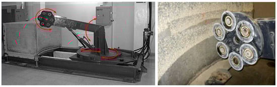 The second research centre is the AGH University of Science and Technology in Krakow, Poland, which has two types of such benches. For many years, the AGH University of Science and Technology has used a full-size stand for testing cutter heads [68]. Recently, another stand for testing the cutting process has been developed based on experiences with the earlier bench. The new full-size stand enables the testing of cutter heads with a diameter of up to 2.2 m (Figure 12).