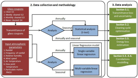 Flowchart of the novel methodology that can (i) evaluate the variability of soiling and its seasonal correlations with environmental factors using the linear regression models and (ii) assess the effectiveness of the different cleaning cycles using the statistical (F- and t-test analysis. The results are presented in the indicated sections.