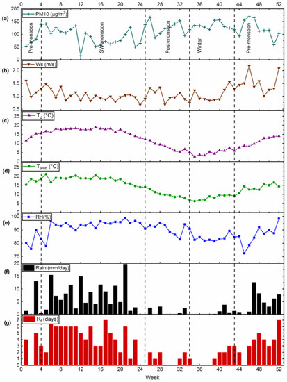 The average weekly value of the environmental parameters (a) particulate matter, PM10 (µg/m3); (b) wind speed, Ws (m/s); (c) dew point temperature, Td (°C); (d) ambient air temperature, Tamb (°C); (e) relative humidity, RH (%); (f) rainfall intensity, Rain (mm/day), which is equal to the direct average, over a given week, of the rainfall recorded in mm per minute multiplied by 60 min × 24 h; and (g) weekly frequency of rainfall Rf (days).