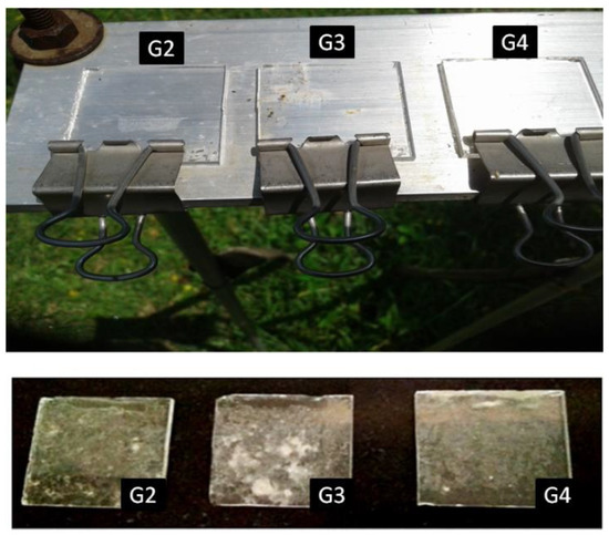 Photographs of the glass coupons placed outdoors having different cleaning cycles, weekly cleaned (G2), monthly cleaned (G3), and never cleaned (G4) (above), and an example of the non-uniform distribution of soiling observed, for example, at week 45 (below).