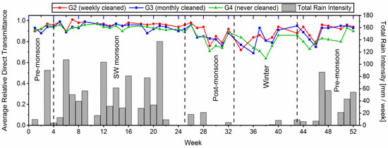 The average relative direct transmittance of glass coupons with different cleaning cycles (G2, G3, and G4) and total rainfall intensity (in mm/week) in consecutive weeks of the year.