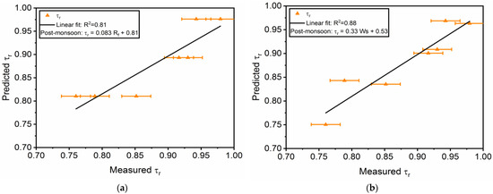 Previous studies revealed the combined effect of PM10 and Rf [47], rainfall and Ws [48], and Ws and RH [22] to significantly affect soiling at the investigated locations. In this work, the significant correlation between the τr and various environmental parameters determined seasonally and annually is presented in Table 3. (For orientation, refer to the lower right side of Figure 1.) Based on the relation obtained between the input environmental parameters and the τr for different seasons of the year, the predicted and measured datasets were plotted to obtain a linear relation using the linear regression method as shown in Figure 10, Figure 11 and Figure 12 (For the correlation values obtained between the predicted and measured τr, see Table S7.) and the statistical errors such as mean square error (MSE) and root-mean-square error (RMSE) were calculated using Equations (13) and (14) and are listed in Table 3.