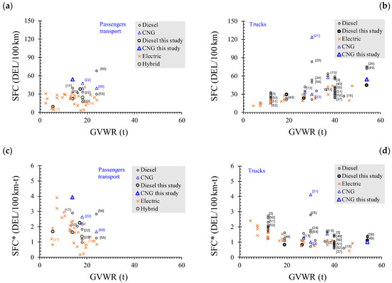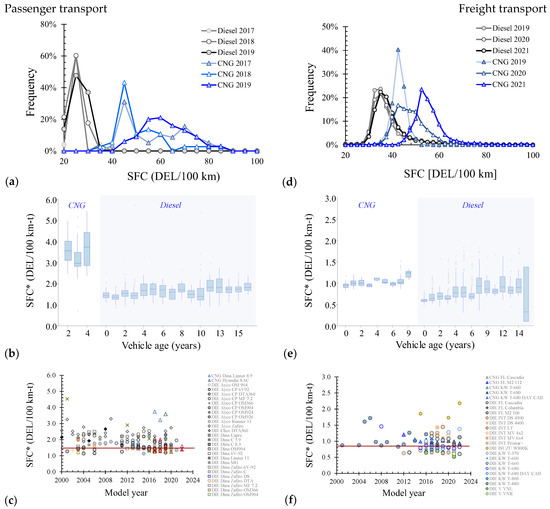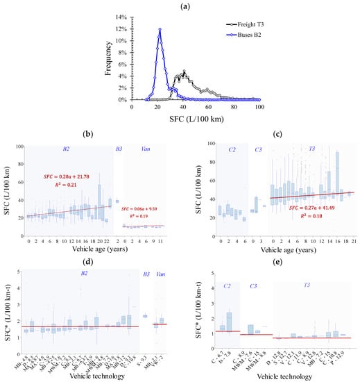 - Fleet administrators tend to disregard worst-performing vehicles regardless of vehicle age. Considering that the cost associated with fuel consumption represents 40–50% of the total operative cost, fleet administrators tend to disregard the vehicles that, under the frequent conditions of use (traveled routes, load percentage, usual drivers, etc.), exhibit high fuel consumption. Thus, the observed SFC of old vehicles corresponds to the vehicles that, under the local conditions, exhibit satisfactory SFC.