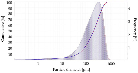 The particle size distribution analysis showed that the minimum particle size is 0.6 µm and the maximum is 720 µm. The particles in a size range of 710–1000 µm represent 0.013% of dust, which is the rarest frequency of particle sizes. The most frequent particle sizes are in the range of 100–150 µm (16,270%).