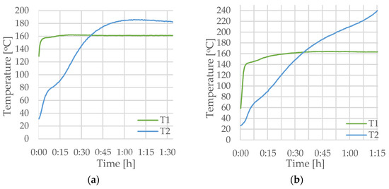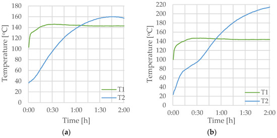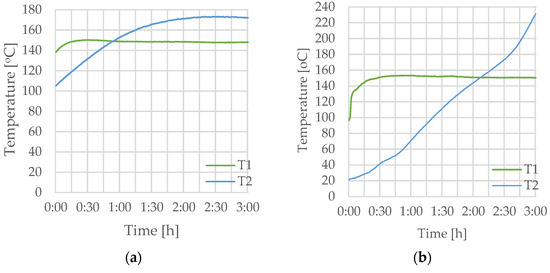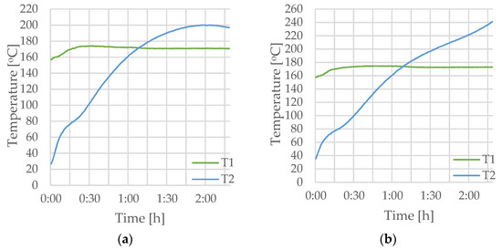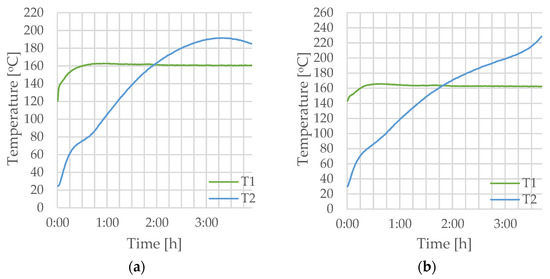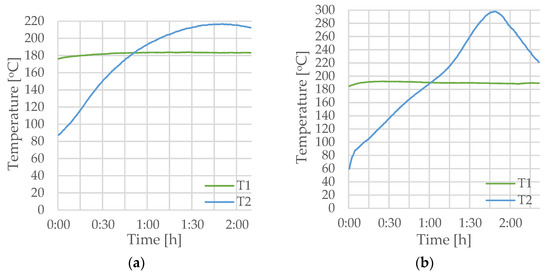 The temperature of sludge dust in different sample baskets and the furnace temperature are presented in Figure 4, Figure 5, Figure 6, Figure 7, Figure 8 and Figure 9. The T1 curve stands for the furnace temperature and the T2 curve for the sample temperature.