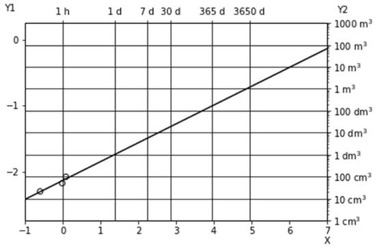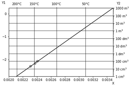 where is the ratio of volume to the area, is temperature, is the base of the natural logarithm, and are fit constants. For the purpose of fitting, (3) was log-transformed to represent the form of the linear dependence of the logarithm of on inverse temperature. This approach was widely used in the investigations, according to EN 15188, as well as in research papers [33,34,35,36]. The fitting was conducted using the Python [37] Numpy polyfit routine [38].