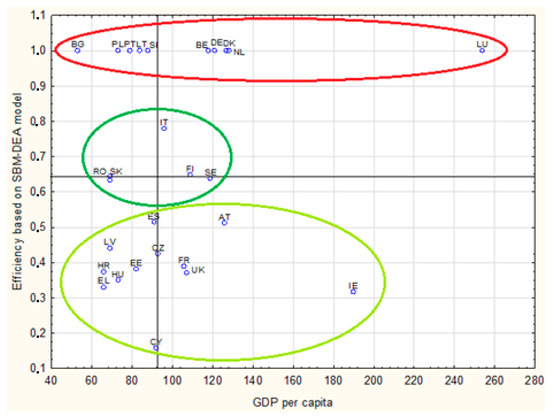 - Eco-efficiency leaders—A group of countries in which the road freight sector was considered efficient (the efficiency index was equal to 1)—Slovenia, Belgium, Bulgaria, Portugal, Denmark, Germany, Poland, Netherlands, Luxembourg and Lithuania. This group includes both countries with a higher than the median level of GDP per capita and a lower level of economic development.