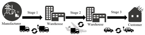 Figure 2. The product produced by the manufacturer is initially transported to the sorting facility/warehouse, where it is then transported to the warehouse covering the area for the distribution of goods to the customer. We can now see the electrification of vehicles at stage 3. Companies such as Amazon and DHL Post are already using EVs within cities to deliver ordered products. Stage 1 and 2 electrification is less common and poses a lot more challenges, but it is also feasible. The electrification of the transport sector is the subject of an analysis described previously [