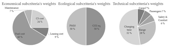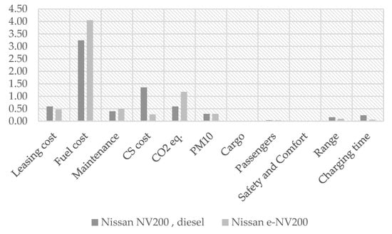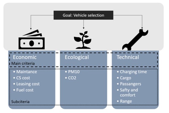 Therefore, this paper presents a model to compare the costs associated with the use of a fleet of combustion vehicles and a corresponding fleet of EVs. The cost associated with the use of vehicles of both types was determined. Based on the analytic hierarchy process (AHP) algorithm, the potential best solution for the company was determined based on three categories (economic, technical and ecological). The AHP method has been used, among other methods, for the dimensioning of microgrid components and has been described previously [