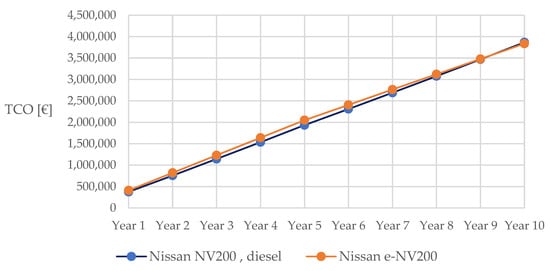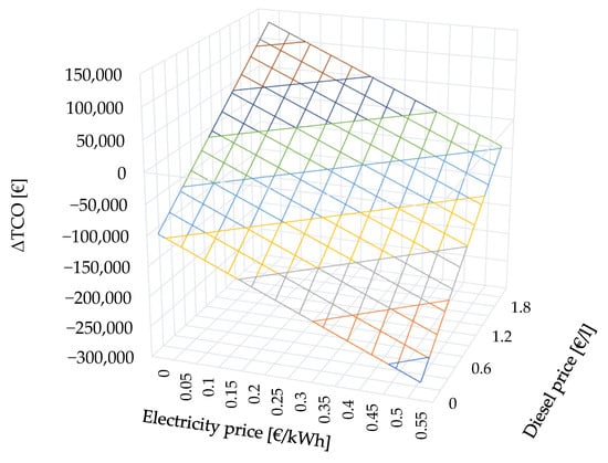 It can be seen that the fleet cost is higher for a fleet of EVs. The biggest impact here is the installation of the charging infrastructure, which is necessary for the proper operation of the BEV fleet. This is, nevertheless, a one-off cost, occurring at the beginning of the investment. As shown in the earlier analysis, costs for the electric fleet decrease over time within a few years of the investment. In addition, a fuel price can be determined for the fleet at which an EV becomes economically preferable. The objective function in this case will take the form ∆TCO ≥ 0.