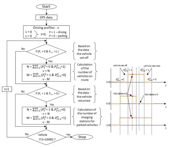 Figure 14. The results of the algorithm are two values representing the number of vehicles that are on the road at the same time and the number of charging stations that would be sufficient to charge vehicles between routes. The algorithm checks whether the vehicle is on route or parked on company premises for each measurement point. The criterion that must be met is that all routes are completed within the designated intervals according to the profiles recorded.