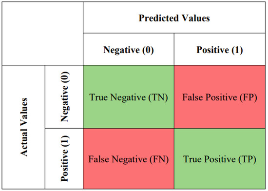 The confusion matrix, unlike accuracy, considers both the predicted and the actual values, providing an overall picture. Four categories of results are defined: True Positive (TP), True Negative (TN), False Positive (FP), and False Negative (FN). A result is TP (or TN) if it is labeled as positive (or negative) in the test set and comes correctly predicted by the algorithm. Instead, an FP (or FN) is a positive (or negative) labeled outcome that is incorrectly predicted by the algorithm [31].