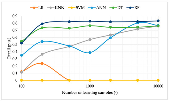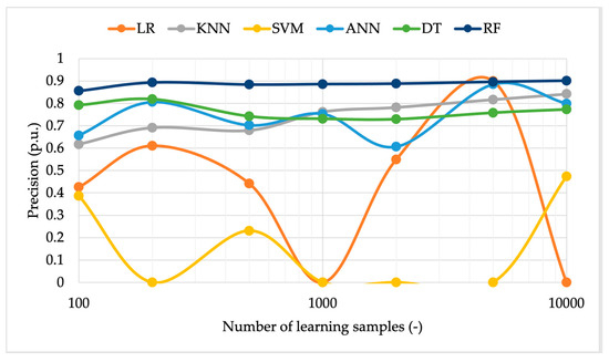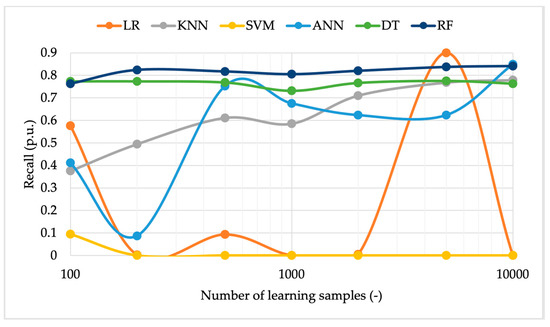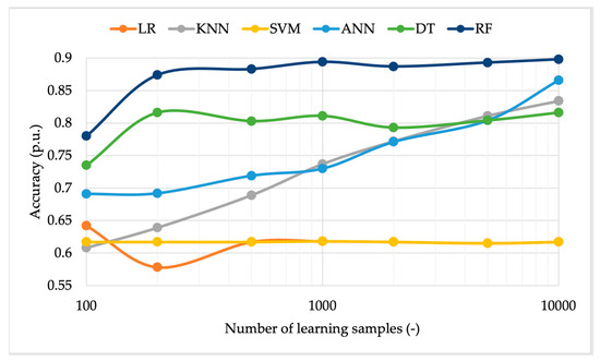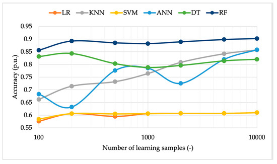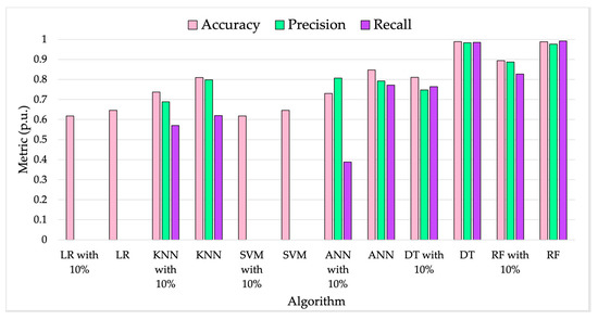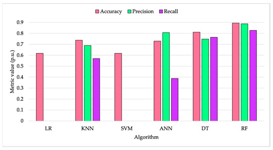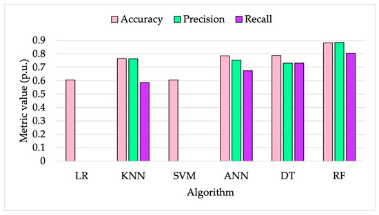 A set of six algorithms has been selected for the sake of comparison and evaluation. The set consists of LR, SVM, KNN, DT, RF, and ANN. They are the typical algorithms implemented in the literature for binary classification tasks. For the implementation of the selected algorithms, the Scikit Learn library [53] in Python language has been used. No tuning has been applied to the algorithms. As described in Section 2, each algorithm has advantages and disadvantages depending on its application. However, they are all suitable for being assessed in the cable joint case study. As a matter of fact, no common or standard practice is available for the application of AI to power systems.