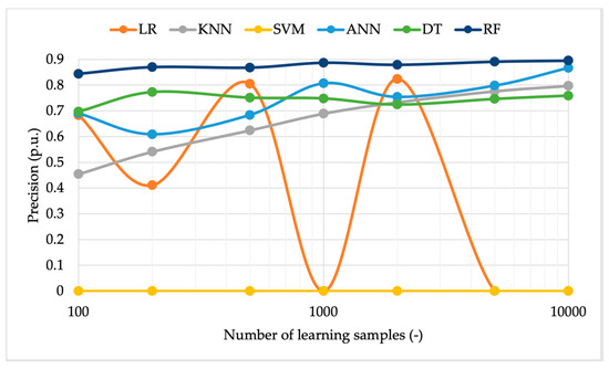 According to the results, some algorithms, such as DT and RF, are not affected by variations in the number of faults in the learning test. These two algorithms perform well in all conditions, and it is reflected in the three metrics. As for ANN and KNN, their performance slightly increases with the increase in the percentage, providing the best results with 50% of faulty cases. Finally, LR and SVM do not perform well in any of the cases, showing better results only for precision and recall in the 50% case. However, this result was expected considering the underfitting problems highlighted in the previous tests.