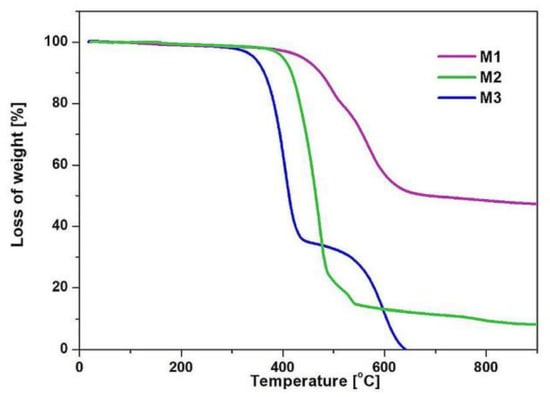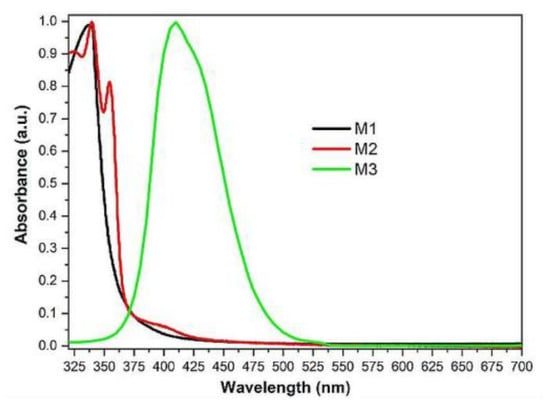 Research on the thermal stability of chemical compounds is fundamental in determining the possibility of their use. Therefore, the M1–M3 derivatives were tested by themogravimetric analysis (Figure 1 and Table 1). Interestingly, the tested compounds differ in thermal properties. The derivative M3 is the least stable. Its 5% weight loss (T5) is already observed at 343 °C. On the other hand, the replacement of 2,2′-bithiophene-5-yl substituents with N-ethyl-9H-carbazol-3-yl increases M3 stability (by 57 °C) to 400 °C. The best results are characterized by M1 (T5 = 437 °C) having two 9,9-diethyl-9H-fluoren-2-yl substituents. Considering the obtained results, we can assume that the two substituents 2,2′-bithiophene-5-yl in the M3 structure (in ortho positions related to each other) undergo partial thermal destruction at the temperature of 343 °C.