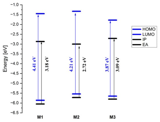 As can be seen (Figure 2), the energy gap values for derivatives M1–M3 are different. We observe a decreasing trend in the magnitude of the energy gap by approximately 0.2–0.3 eV. Compound M3 shows the smallest energy gap, which is mainly due to the low LUMO energy value. The HOMO energy value for M2 (as in the case of M3) suggests that this compound will easily undergo oxidation, although the reduction process will not be as favorable as for M3, increasing the energy gap by about 0.3 eV. For the compound M1, both processes will be difficult; therefore, the Eg of this molecule will be the largest. The DFT calculations performed were consistent with the results obtained experimentally for all molecules under consideration. Based on the obtained geometry, TD-DFT calculations were then performed. The experimental and theoretical spectra are presented in Table 2. All compounds absorb light in a wide band with an absorption maximum between 337 nm and 409 nm. The first band describes the π-π* transitions. This band corresponds to the HOMO → LUMO transitions. In the case of the M2 compound in the discussed band, we are also dealing with H-1 → LUMO and HOMO → L + 1 transitions. The oscillator strength for all transitions corresponds to HOMO → LUMO above 0.04.
