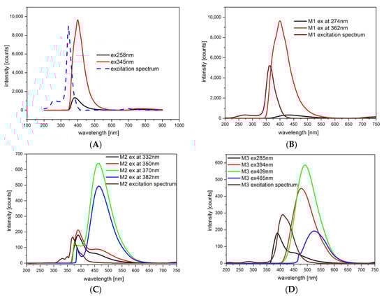 Emission and excitation spectra of investigated compounds: (A) M1 in MeCN (c = 1 × 10−5 M); (B) M1 in CH2Cl2 (c = 1 × 10−5 M); (C) M2 in CH2Cl2 (c = 1 × 10−5 M); (D) M3 in CH2Cl2 (c = 1 × 10−5 M).