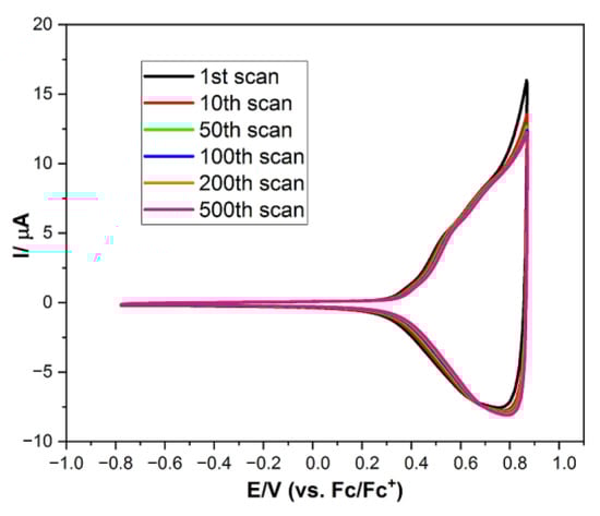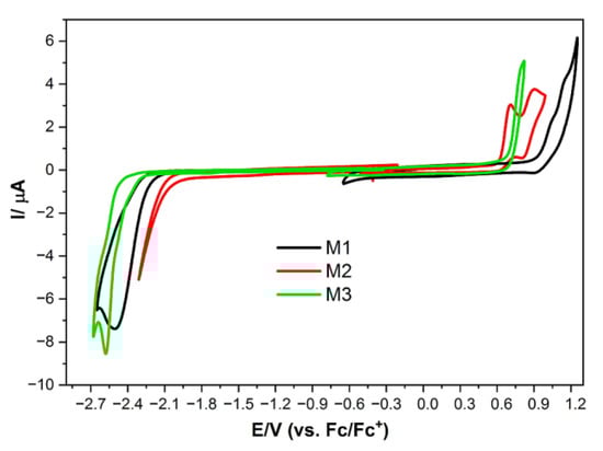 All of the obtained compounds were investigated electrochemically in their diluted CH2Cl2 solutions. By using cyclic voltammetry (CV), one can easily estimate a molecule’s HOMO and LUMO energy level and energy gap (Eg), assuming the IP of ferrocene equals −5.1 eV [45].